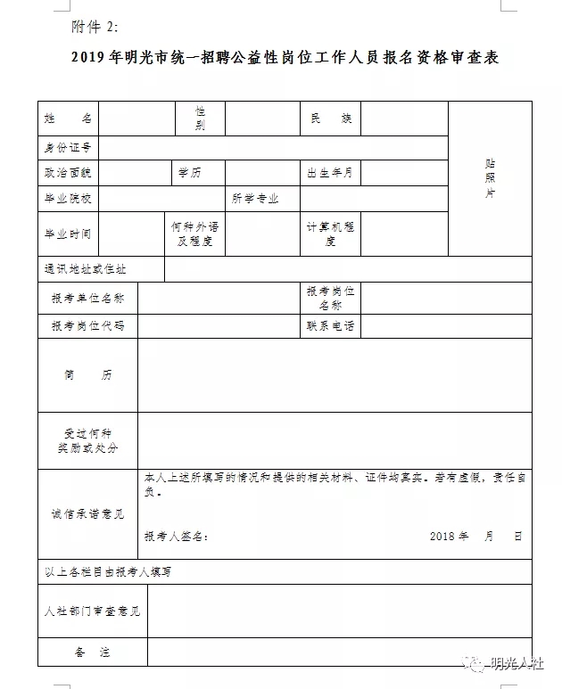 2:《2019年明光市統(tǒng)一招聘公益性崗位工作人員報(bào)名資格審查表》