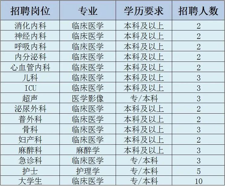 臨床醫(yī)生、護士,具有相關(guān)專業(yè)執(zhí)業(yè)資格、二級及以上醫(yī)院從業(yè)經(jīng)歷者優(yōu)先錄用。