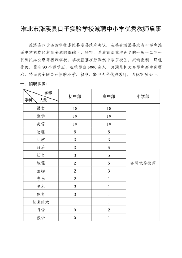 淮北市濉溪縣口子實(shí)驗(yàn)學(xué)校誠聘中小學(xué)優(yōu)秀教師啟事