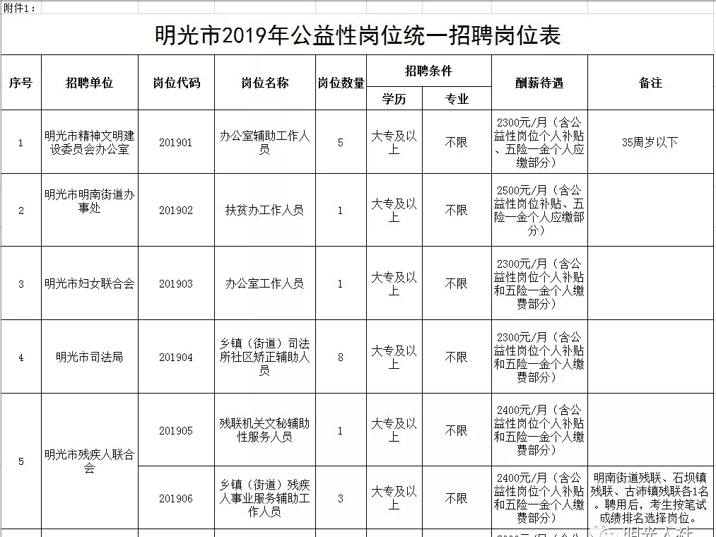 附件1:《明光市2019年公益性崗位統(tǒng)一招聘崗位表》