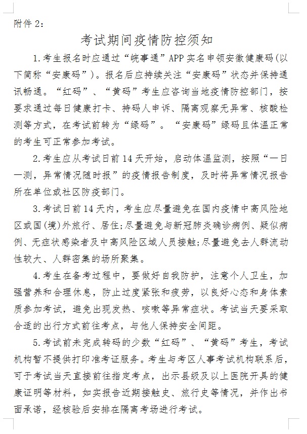 報(bào)考人員報(bào)名前,應(yīng)通過“皖事通”APP實(shí)名申領(lǐng)“安康碼”。報(bào)考人員報(bào)考前請(qǐng)認(rèn)真閱讀《考試期間疫情防控須知》(附件2)。報(bào)考人員提供的信息必須與本人實(shí)際情況、報(bào)考條件和所報(bào)考的崗位要求相一致。凡弄虛作假通過資格審查,其實(shí)際情況與報(bào)考條件規(guī)定不符的,一經(jīng)查實(shí),即取消考試、聘用等資格。